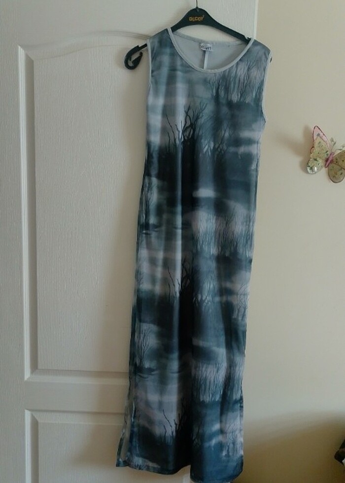 Üstü desenli şifon altı astarlı yanda iki yırtmacı var boyu 133 cm. Koltukaltından koltuk altına 48 cm. 36 beden e uyumlu