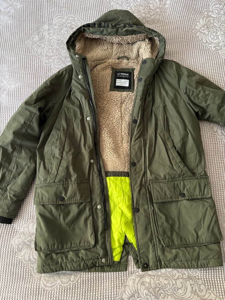 Dik yakalı ve uzun kollu yeşil erkek çoçuk mont, rahat loose fit kesimlidir. İç kısmı kürklü yumuşak kumaşla kaplı, midi boyda ve dış mekan kullanımı için uygundur. Desensiz ve trend sokak stiline uygundur.