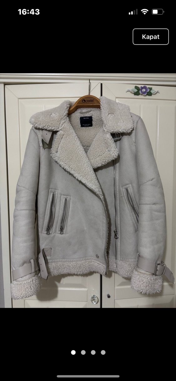 Krem rengi, peluş detaylı Bershka pilot ceket. Rahat ve şık bir görünüm sağlar. Fotoğrafta gri gibi çıkmış fakat Ekru renginde