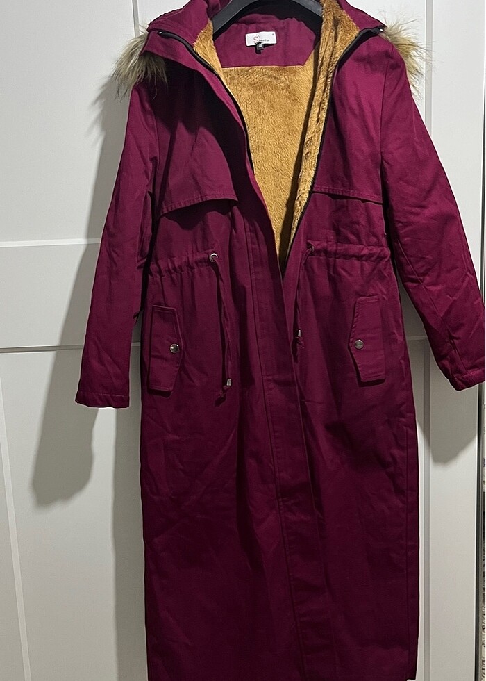 Ürün rengi bordo içi yünlü sıcak tutuyor. Boyu 120cm belden büzgülü kullanılabiliyor. Temiz ürün defosu yok. Kapşonu fermuarlı çıkabiliyor.