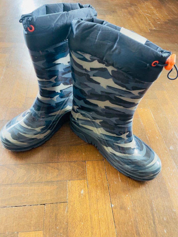 Mavi kamuflaj desenli, lastik malzemeden yapılmış çocuk yağmur botu. Yepyeni.