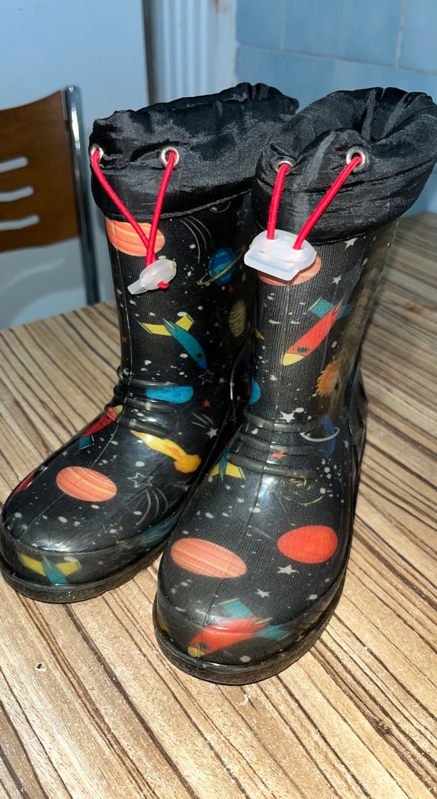Tokalı, lastik malzemeden yapılmış, çok renkli uzay desenli erkek çocuk çizmesi, sokak stiline uygun. Kullanıma bağlı iç kısımda renk değişimi mevcuttur. Deforme yada kullanıma sıkıntılı bir problem yoktur
