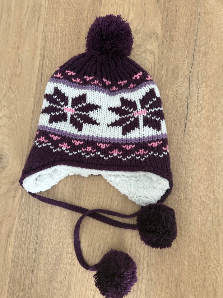 İçi yünlü, mor üzeri desenli şapka. Ölçüleri fotoğrafta göründüğü gibidir. 5-6-7 yaş uyumludur.
