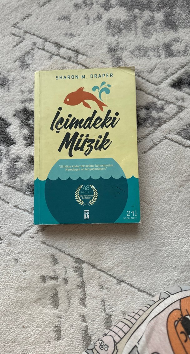 Sharon M. Draper'ın "İçimdeki Müzik" adlı şiir kitabı, içsel duyguları anlatan bir kapak tasarımına sahip. Kitapta balık ve su görseli bulunur. Biraz kırışık
