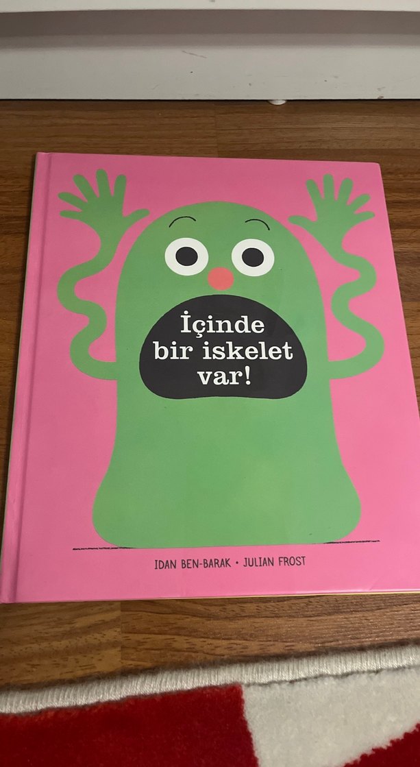 İçinde Bir İskelet Var! adlı çocuk kitabı, pembe kapakta yeşil bir karakterle sunuluyor. Yazarlar Idan Ben-Barak ve Julian Frost'tur.