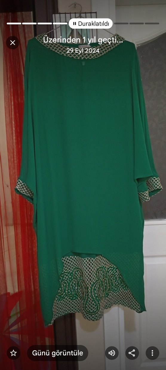 Yeşil renkte, drapeli uzun ve bol kesim straplez elbise. Sentetik kumaştan, desenli ve parlak detaylara sahip, parti için uygun.