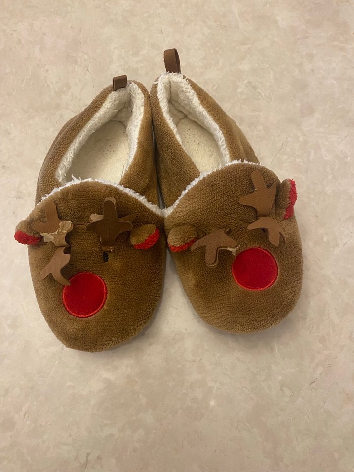 çocukları için kahverengi, yumuşak kumaş ve kürklü detaylara sahip, renkli nakışlı sıcak terlikler. Rahat ve konforlu iç mekan kullanımı için.