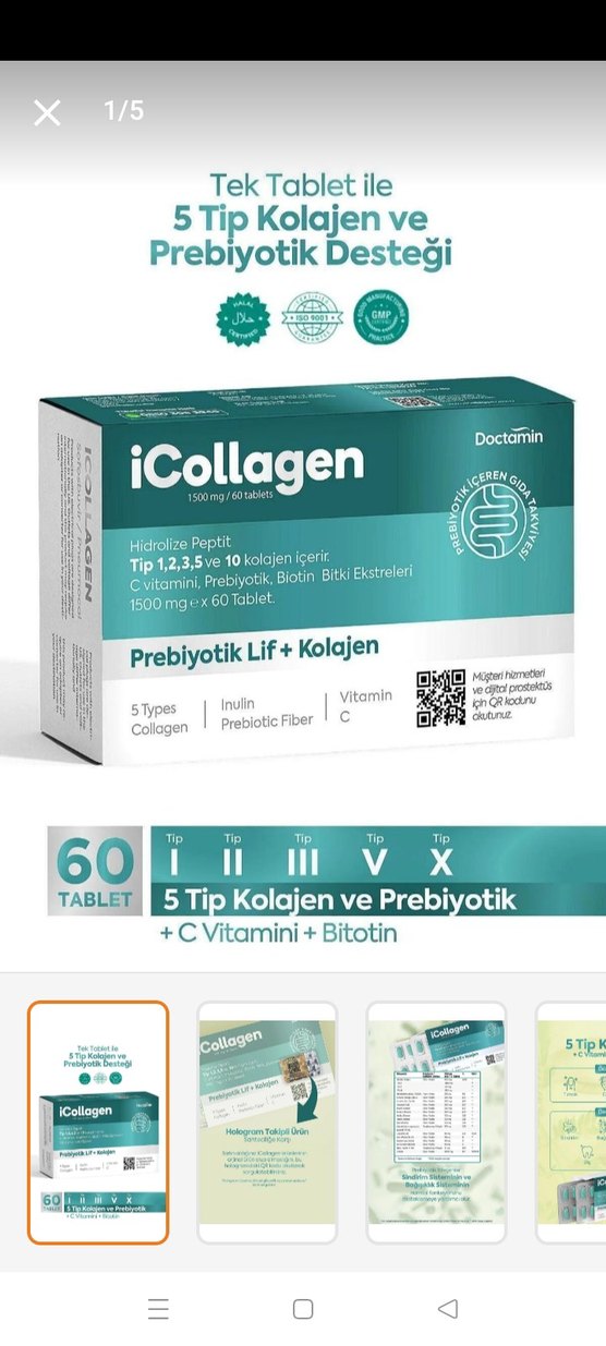 iCollagen, 1500 mg hidrolize peptit, 5 tip kolajen, prebiyotik lif, C vitamini ve biotin içerir. 60 tablet ile cilt sağlığını destekler.