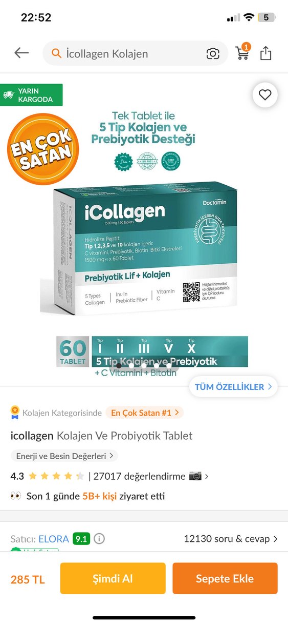 iCollagen tableti 5 tip kolajen, prebiyotik lif, C vitamini ve biotin içerir. 60 tabletlik kutuda kolajen ve bağırsak sağlığını destekler. Sıfır ürün ambalajlı elimde fazla olduğundan satıyorum