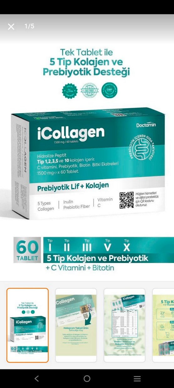 iCollagen 60 tablet, 5 tip kolajen, prebiyotik lif, C vitamini ve biotin içerir. Her kutuda 1500mg yoğunlukta destekleyici içerik bulunur.