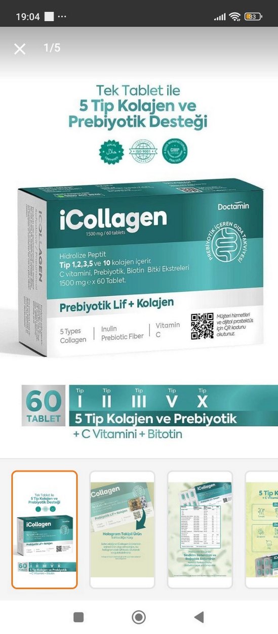 iCollagen tabletler, 5 tip kolajen peptit, prebiyotik lif, C vitamini ve biotin içerir. Her tablet 1500 mg hidrolize kolajen sağlar.