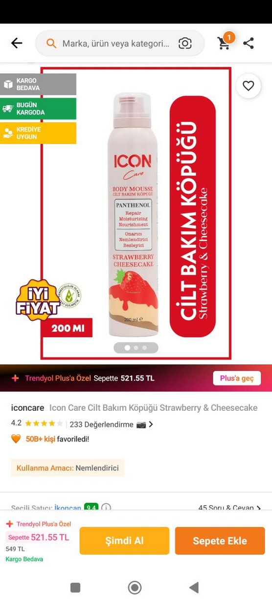 Icon Care çilek ve cheesecake kokulu cilt bakım köpüğü, panthenol ile nemlendirici ve onarıcı etki sağlar. 200 ml boyutunda cilt bakım ürünü. Neredeyse full dolu. Merak edip aldım ama benim parfümüm ile uyumlu olmadı o yüzden kullanamadim. Kokusu çok hoş ve kalıcı