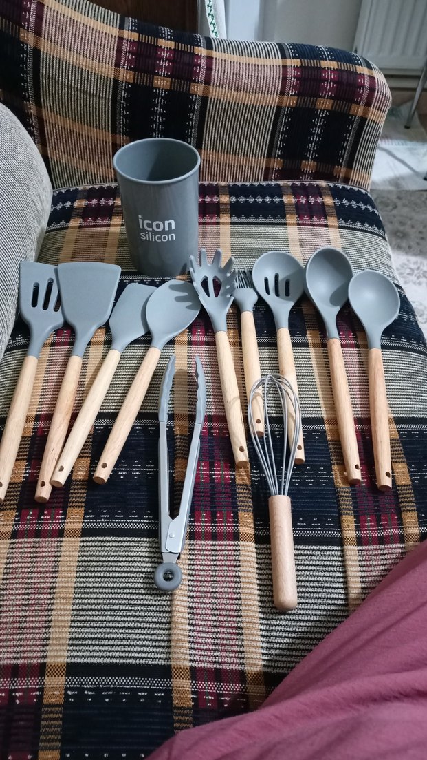 Icon silikon mutfak seti, ahşap saplı gri mutfak gereçleri ve saklama kabı içerir.