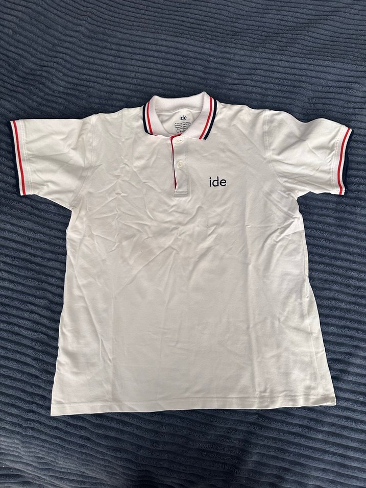 İde Okulları. Erkek beyaz pamuklu polo tişört, yakalı ve kısa kolludur. L beden büyük temiz