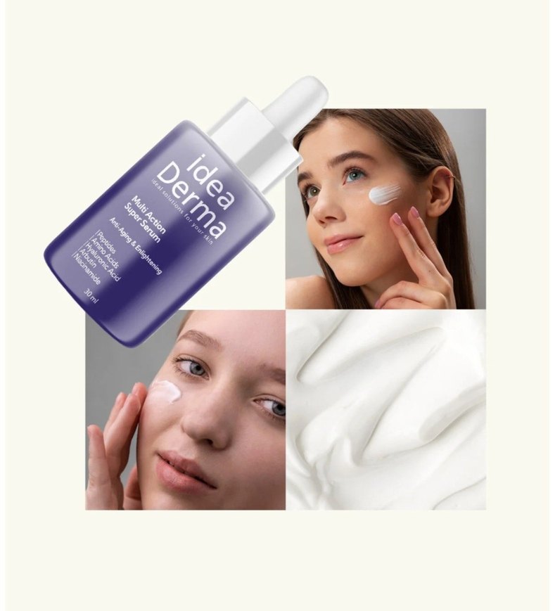 Idea Derma Çok Etkili Serum, cilt yenilenmesini destekler ve nem sağlar. Hızlı emilir, cildin pürüzsüz ve sağlıklı görünmesine yardımcı olur. idea Derma Multi Action Super Serum 30 ml