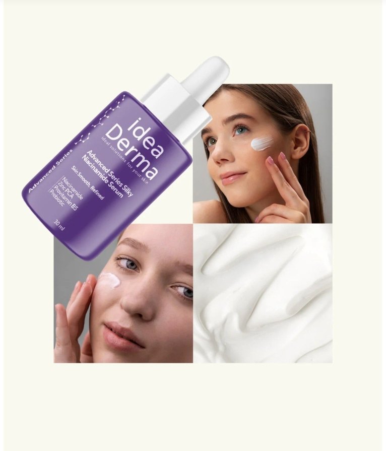 Idea Derma gelişmiş formüllü yaşlanma karşıtı serum, yaşlanma belirtilerini azaltır ve cilt dokusunu iyileştirir. 30 ml damlalıklı şişede. idea Derma idea Derma Advanced Series Silky Niacinamide Serum 30 ml