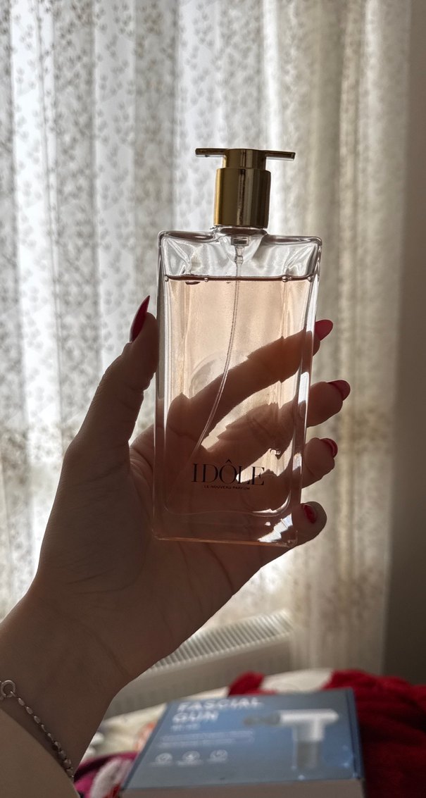 Altın pompalı, şeffaf dikdörtgen şişede hafif pembe renkli IDÔLE kadın parfümü orijinal değildir bir kaç saat kalıcılığı vardır çok az kullanıldı