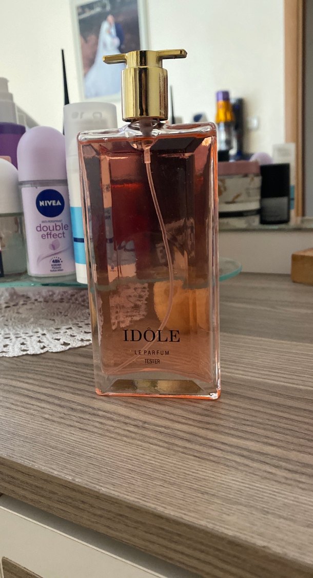 Altın kapaklı ve pembe sıvılı Idôle Le Parfum kadın parfümü tester şişede, ahşap bir yüzeyde sergileniyor. Orijinal değildir