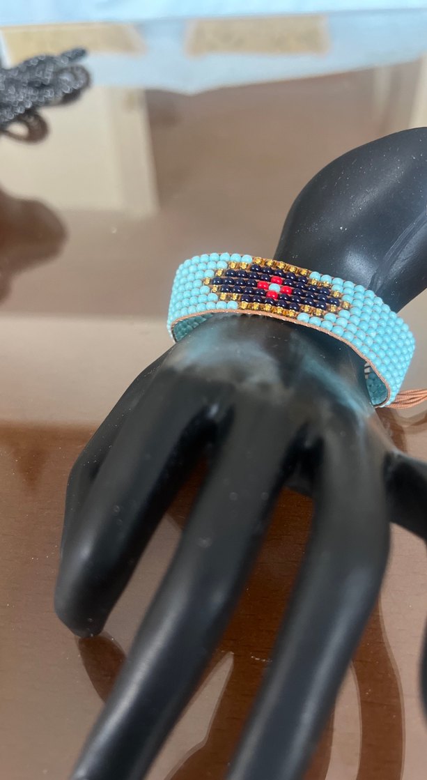 Turkuaz, siyah, kırmızı ve altın renklerde işlemeli el yapımı ince detaylara sahip miyuki bohem tarzda bileklik. Renkli ve retro görünümüyle günlük kullanıma uygundur.