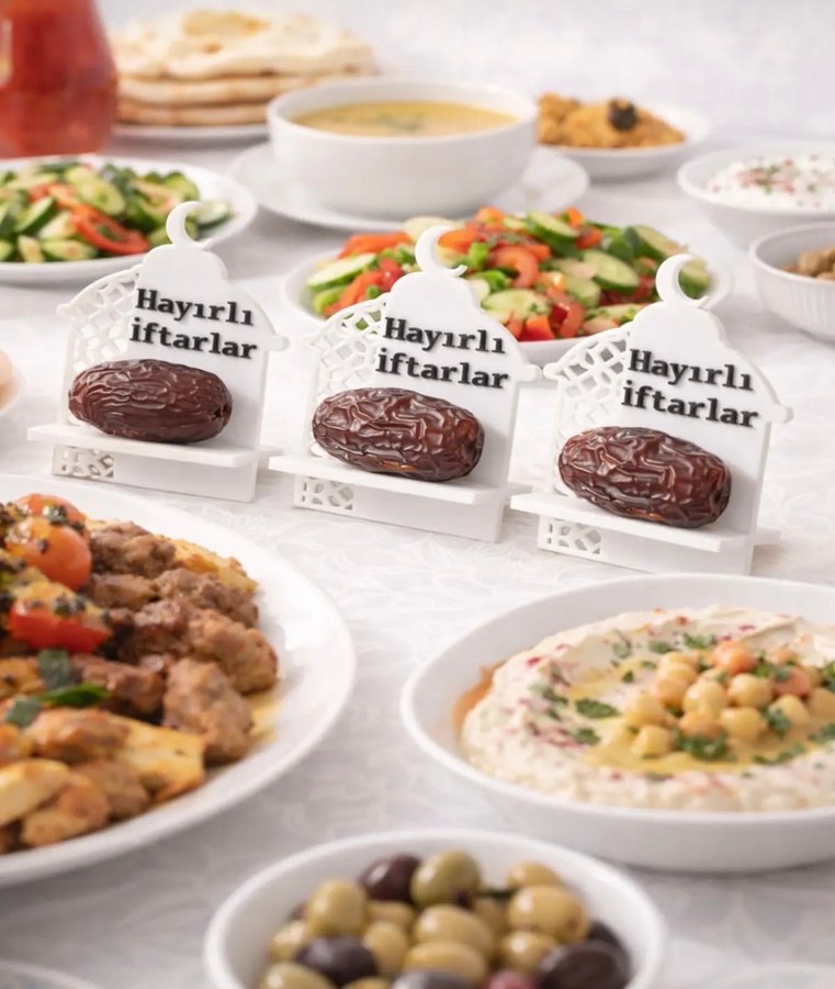 Beyaz renkte, "Hayırlı iftarlar" mesajlı iftar masası standı . Hurma veya küçük yiyecekleri tutmak için uygundur.