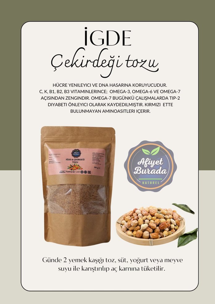 İğde çekirdeği tozu hücre yenileyici ve DNA koruyucudur. C, K, B1, B2, B3 vitaminleri ve omega-3, 6, 7 içerir. Günde 2 kaşık süt, yoğurt veya meyve suyu ile karıştırılarak tüketilir.