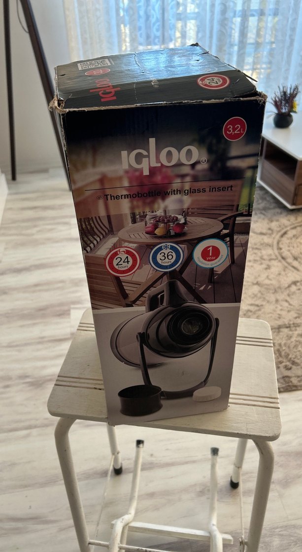 Igloo camlı termos şişe, 3,2 litre kapasite, içecekleri saatlerce sıcak veya soğuk tutar. Gri renkte dayanıklı tasarım. ☕