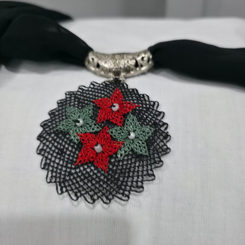 Ortası ve uçları iğne oyası yapılarak çok şık bir görünrü verilmiş,kıyafetlere şıklık katan küçük bir detay,148/10 cm siyah kaliteli şifon kumaş kullanılmış.