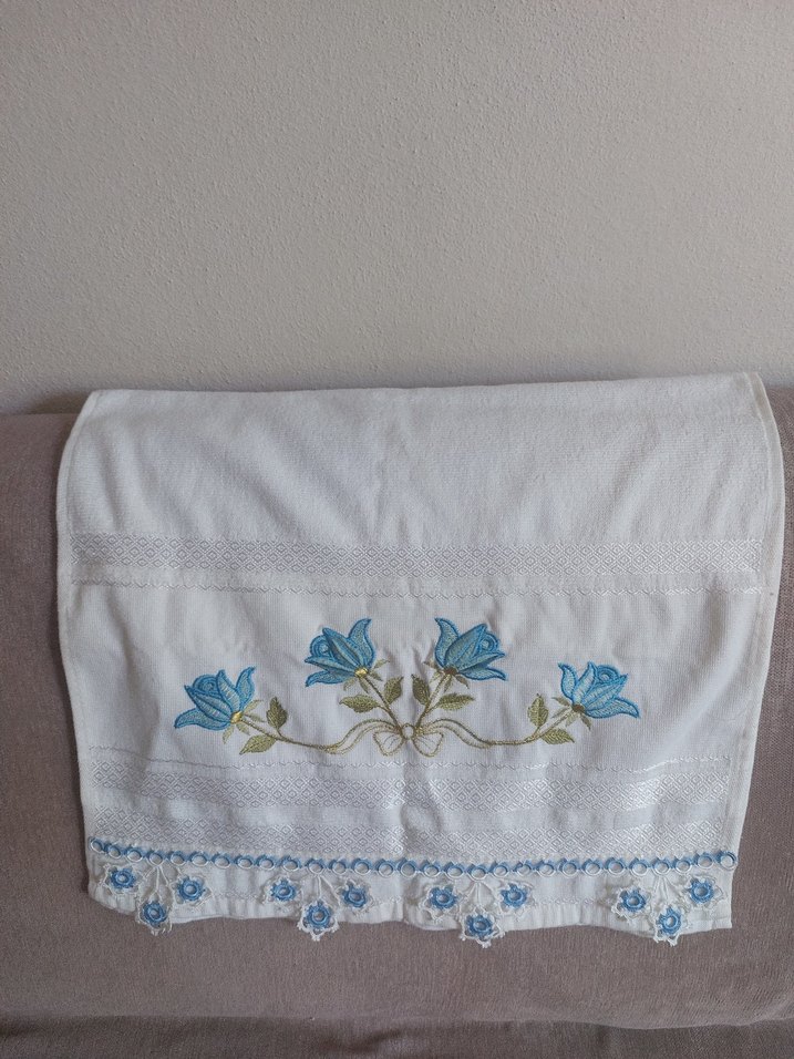 Mavi çiçek nakışlı ve dantel detaylı beyaz havlu, yumuşak ve zarif bir tasarıma sahiptir.%100 pamuktur.Denizli buldanda uretilmistir.(Marka temsilidir)