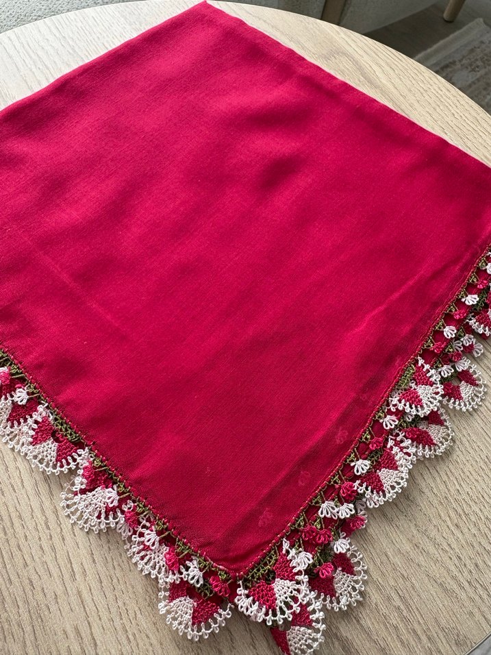 Pembe renkli, iğne oyalı detaylı başörtüsü. Parlak dokusu ve bohem-retro tarzıyla dikkat çeker.