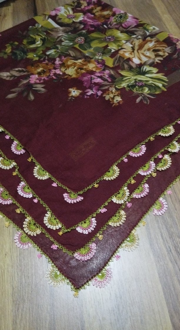 Bordo renkli, çiçek desenli kadın fular, narin iğne oyalı kenar süslemeleriyle bohem tarzını yansıtıyor. Yumuşak dokulu tekstil kumaştan üretilmiştir.