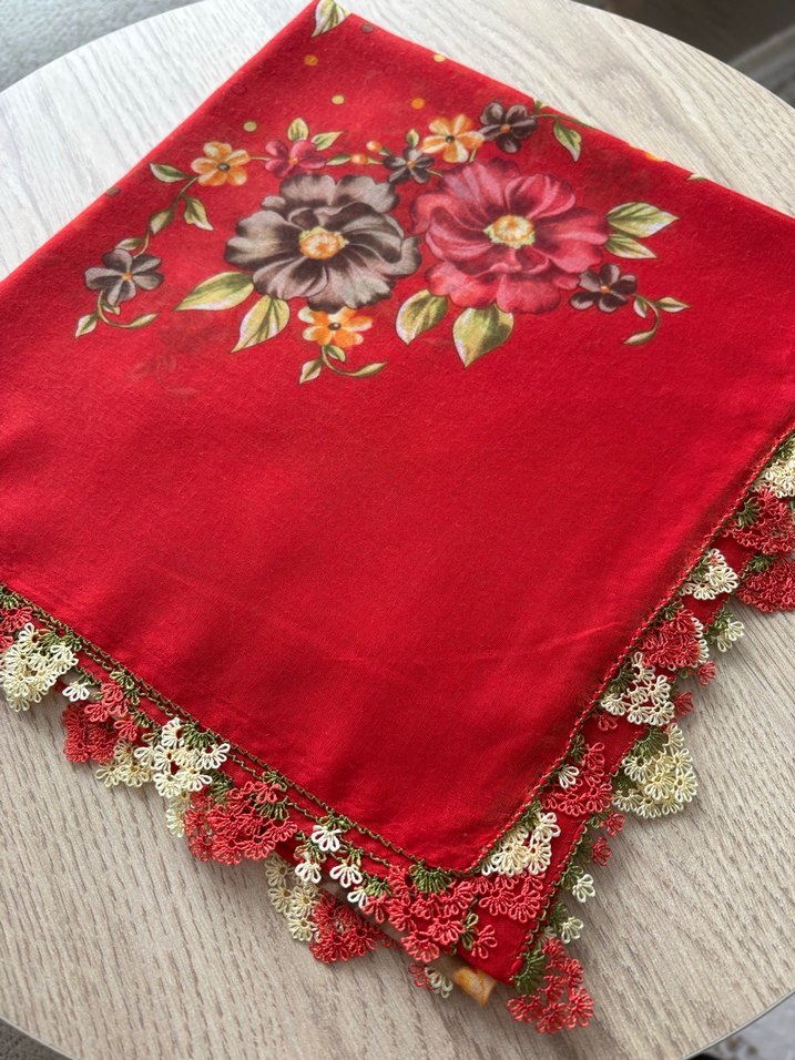Kırmızı renkte, çiçek desenli ve iğne oyalı kenarları olan, parlak görünümlü bohem tarzda başörtüsü. Yumuşak tekstil malzemeden üretilmiştir.