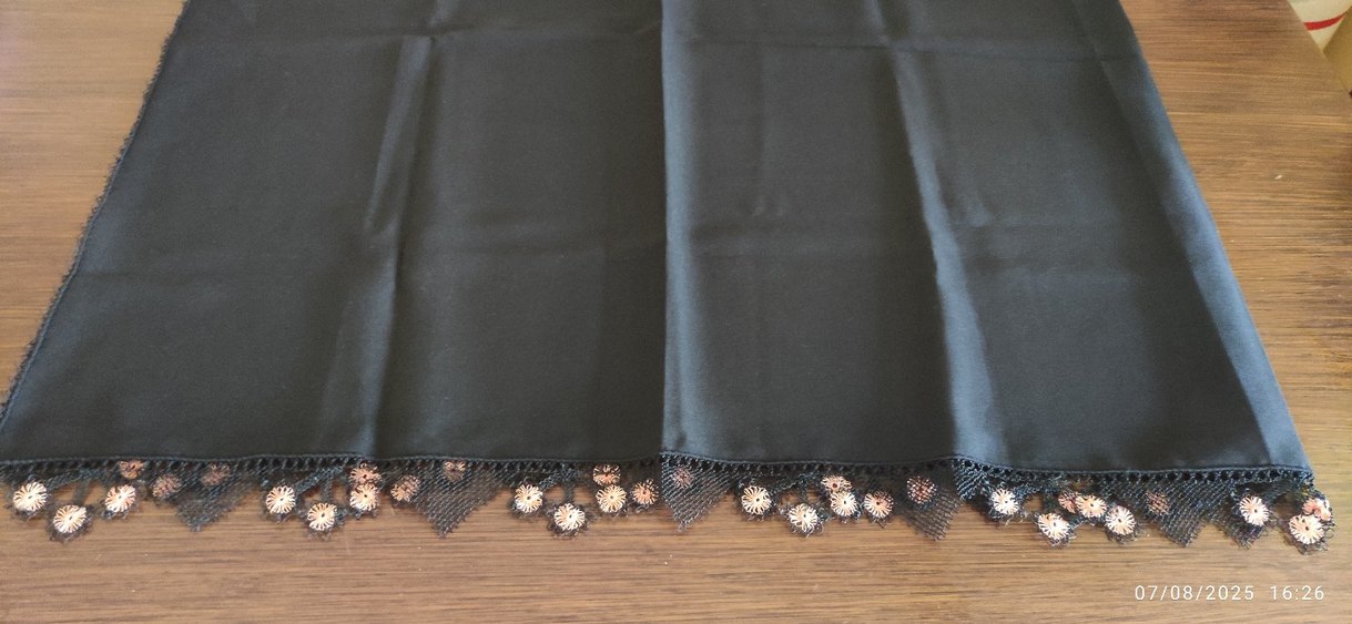 Düz siyah kumaştan mevlid başörtüsü bir kenarı iğne oyalı şık bir görünüm sunar.
