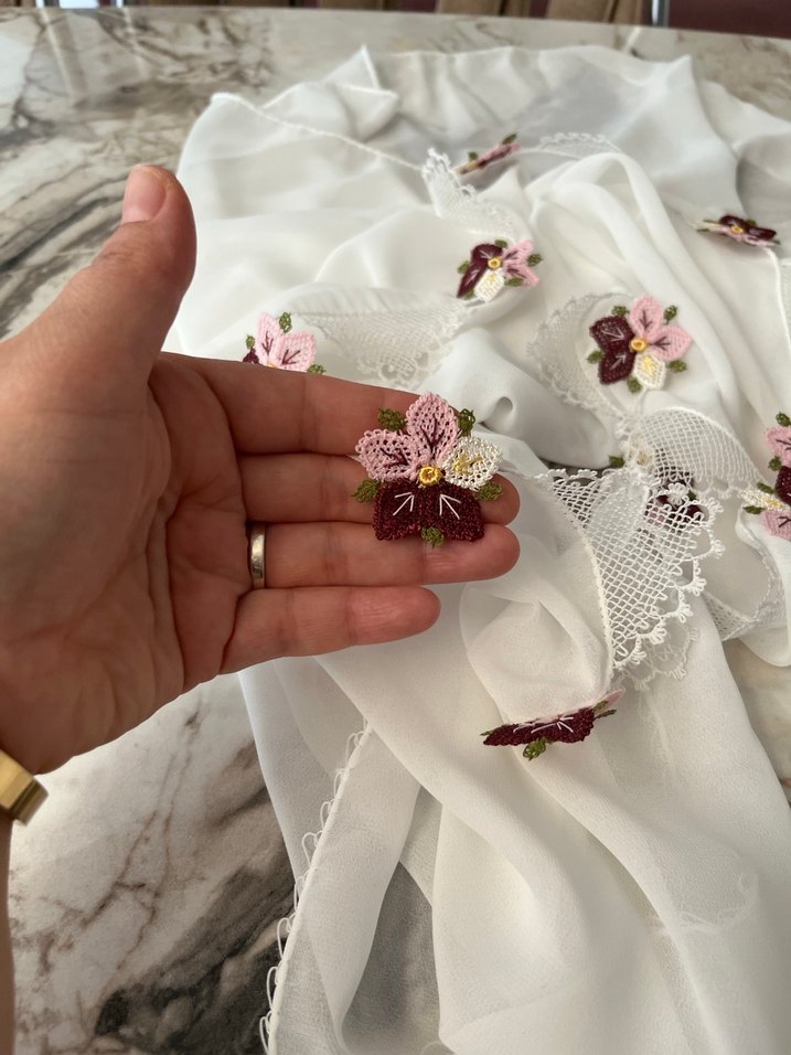 İğne oyalı mevlüt örtüsü kırık beyaz kumaşında motifleri mürdüm rengi toz pembe ve kremden oluşmaktadır tespih içerisinde bulunmaktadır kumaşı multi şifon ölçüleri 150’ye 70