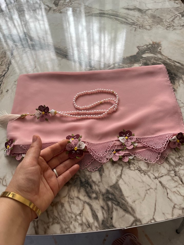 İğne oyalı mevlüt örtüsü pudra rengindedir motiflerinde pudra rengi mürdüm rengi ve de krem bulunmaktadır tespih içerisindedir kumaşı multi şifondur ölçüleri ise 150’ye 70 cm