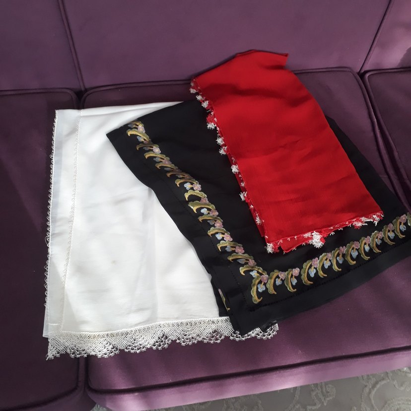 Beyaz, siyah ve kırmızı renklerde igeme oylidir .kirmizi oln karedir birdefa gelin basında kullanildi. beyaz oln ise bir yada ilkdefa kullanıldı işlemesi çok ağır ığne oyasi vardir dikdörtgendir. siyah oln ise boyama ve ığne oyasıyla kumaştan tel çekilerek kenar yaplmistr dikdortfendir