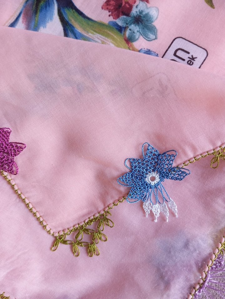 Pastel pembe renkte, dantel detayları ve çiçek nakışlı bohem tarzı kadın fularıdır. Yumuşak kumaştan üretilmiştir, retro ve hippie stillere uygundur.
