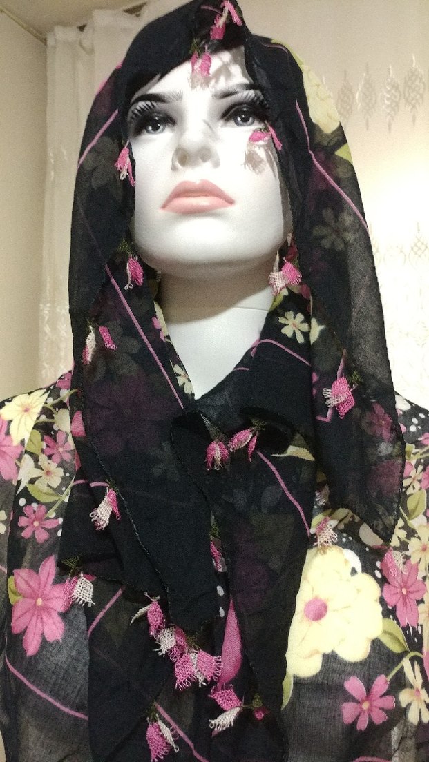 Siyah zemin üzerine çiçekleri olan yazmanın kenarlarına krem pembe yeşil renklerinde iğne oyası yapılmıştır Yazmanın ölçüsü 95 cm ( Görsel ve ürün kendime aittir )