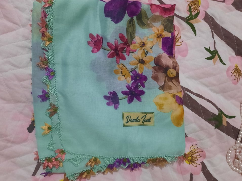 Kadınlar için pastel çok renkli çiçek desenli, yumuşak sentetik kumaştan yapılmış fular. Dantel detayları ile bohem tarzı yansıtıyor.