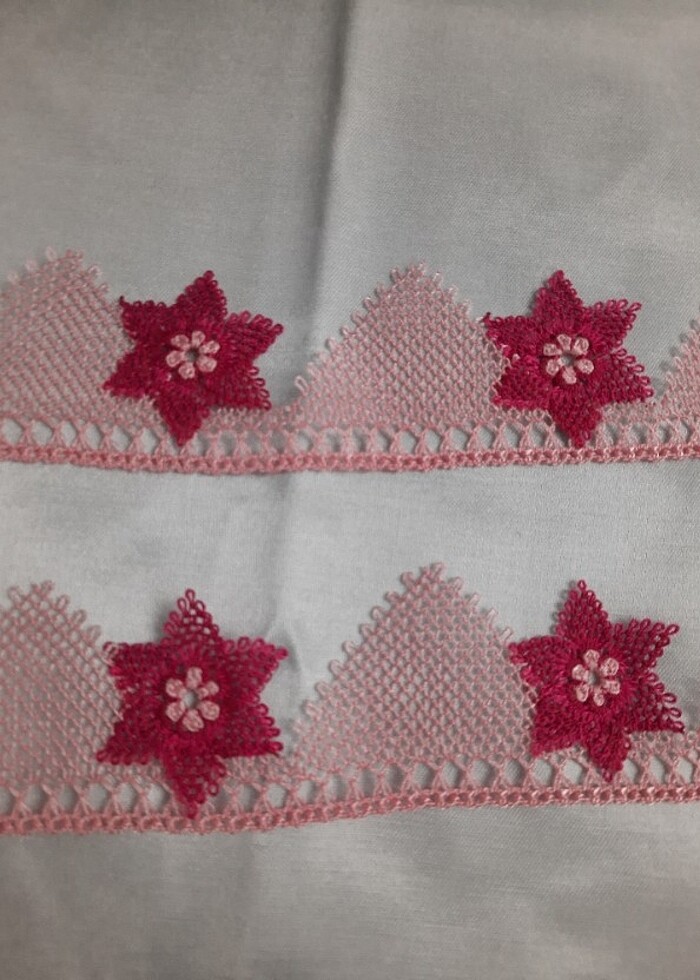 Büyük havlu boyutlarında 2 kenar iğne oyası fotoğrafta görünen renk değişebilir. Çingene pembe ve toz pembeden oluşuyor.