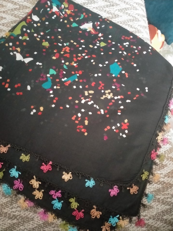 Boncuk işlemeli, kelebek detaylı çok renkli, koyu tonlu kadın fular, bohem tarzını yansıtıyor.