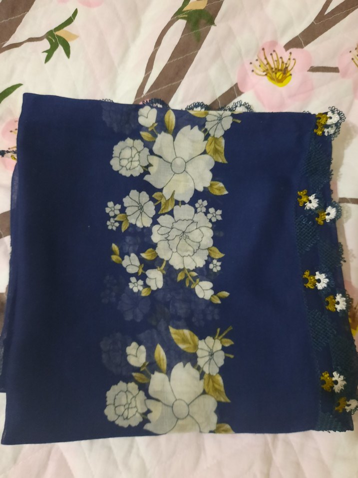 Yumuşak sentetik kumaştan, beyaz çiçek desenli, mavi bohem tarzda kadın şalı. Drapeli tasarımıyla retro ve hippie görünüme uygun.