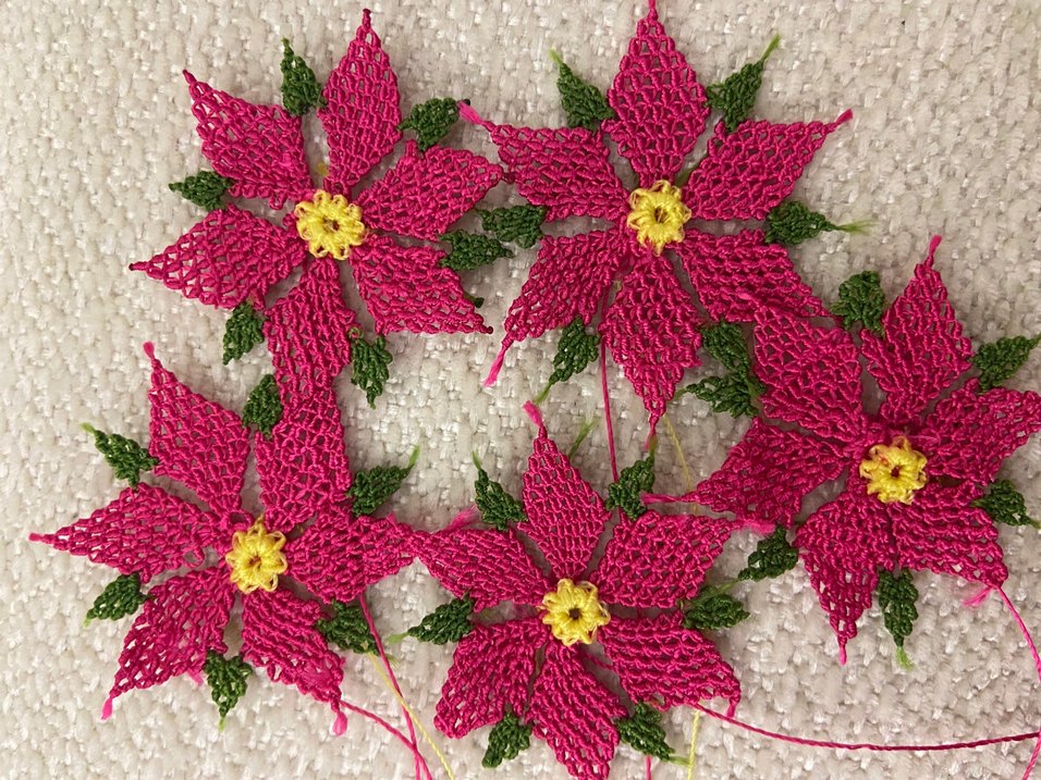 Canlı pembe ve yeşil renklerde, detaylı işlemeli el yapımı çiçek motifleri çeyizlik için uygundur (tane fiyatıdır)