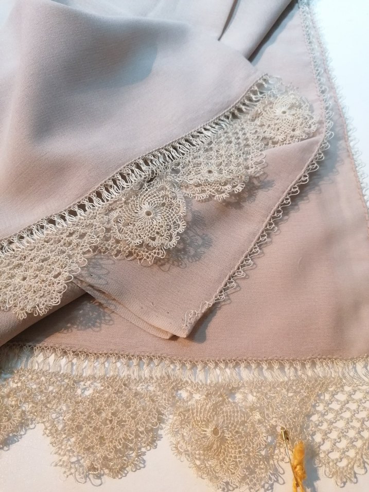 Yumuşak tekstil malzemeden üretilmiş, dantel detaylı bej kadın şalı, klasik ve vintage tarzı yansıtır. İğne oyası mevlüt örtüsü. Elemeğidir. #igneoyası #mevlütörtüsü #handmade #aksesuar #kadın #woman #kadıngiyim #brand #elemegi