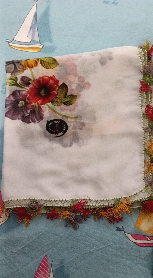 Çiçek desenli çok renkli hafif tekstil üzerine iğne oyalı yazma