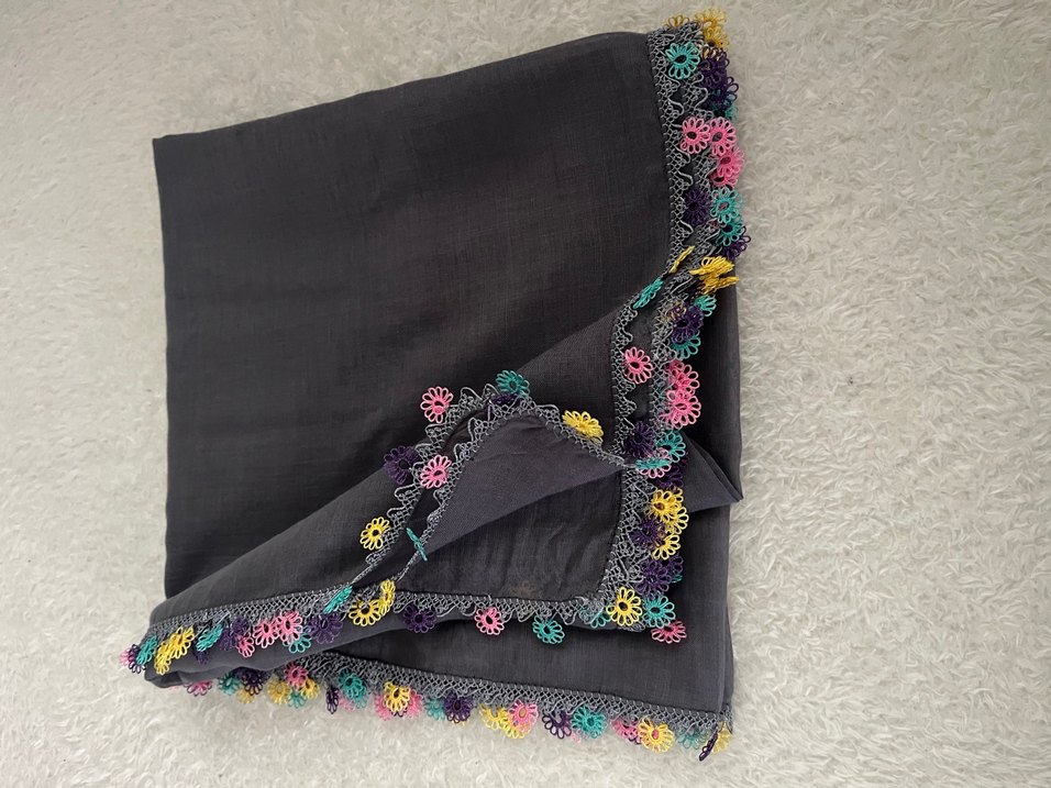 İğne oyası Detaylı Gri Kadın eşarp&yazma&tülbent 90*100 cm ebatlıdır.