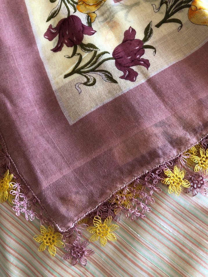 İğne oyası detaylı mor renk ağırlıklı hiç kullanılmamış tülbent
