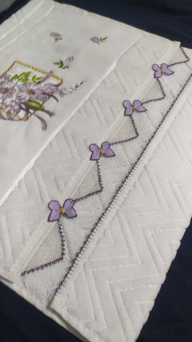 Nakışlı kelebek ve çiçek desenleriyle pastel beyaz havlular, ince dantel detaylı, yumuşak ve klasik tarzda.
