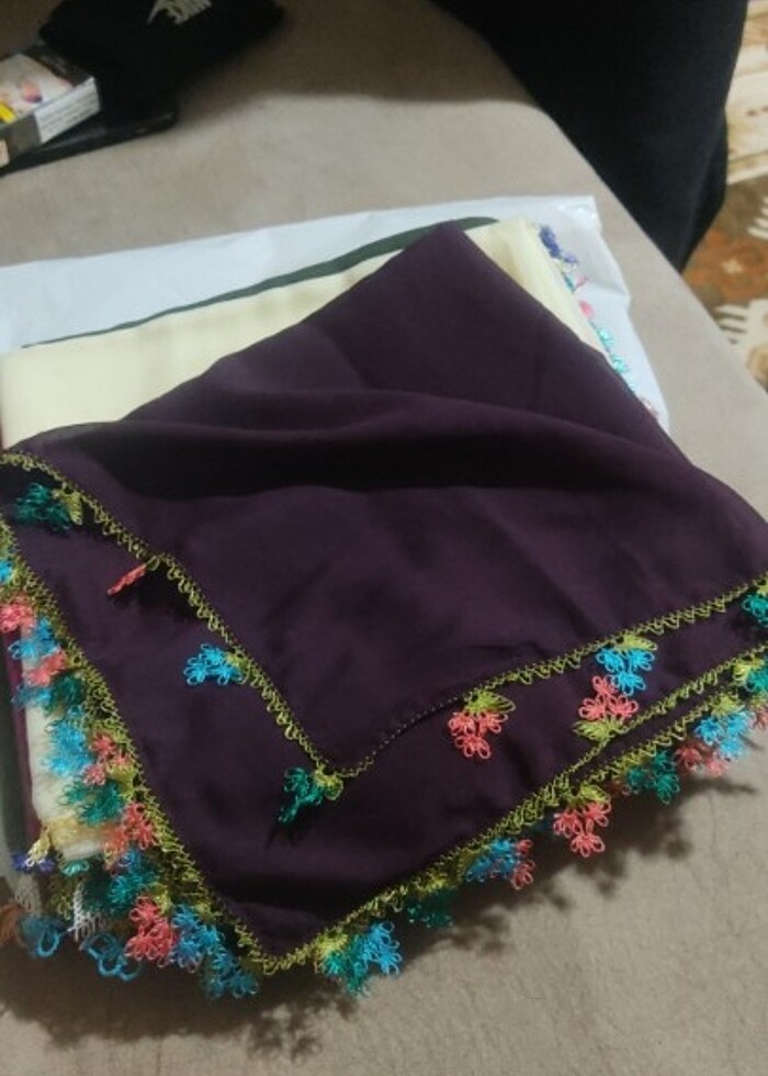 El emeği ürünlerdir eşarp in etrafına yapılmış iğne oyalarindan yapılmıştır Adet fiyatı:600tl