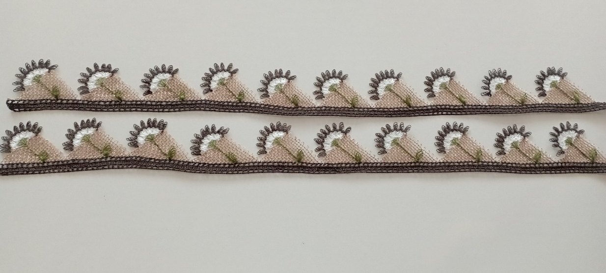 Bohem tarzı işlemeli, narin çiçek desenli ve yumuşak tül kumaştan yapılmış dantel şeritler, el işi ve süsleme için uygun.