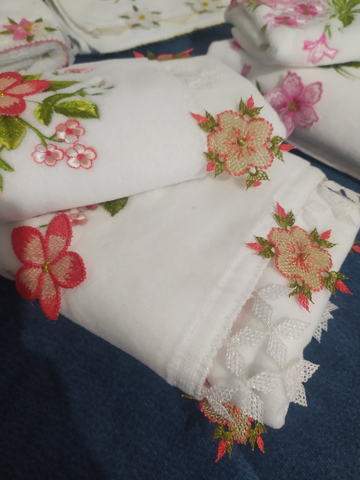 Renkli çiçek nakışları ve ince dantel kenarlarıyla beyaz havlu. Yumuşak ve dekoratif.